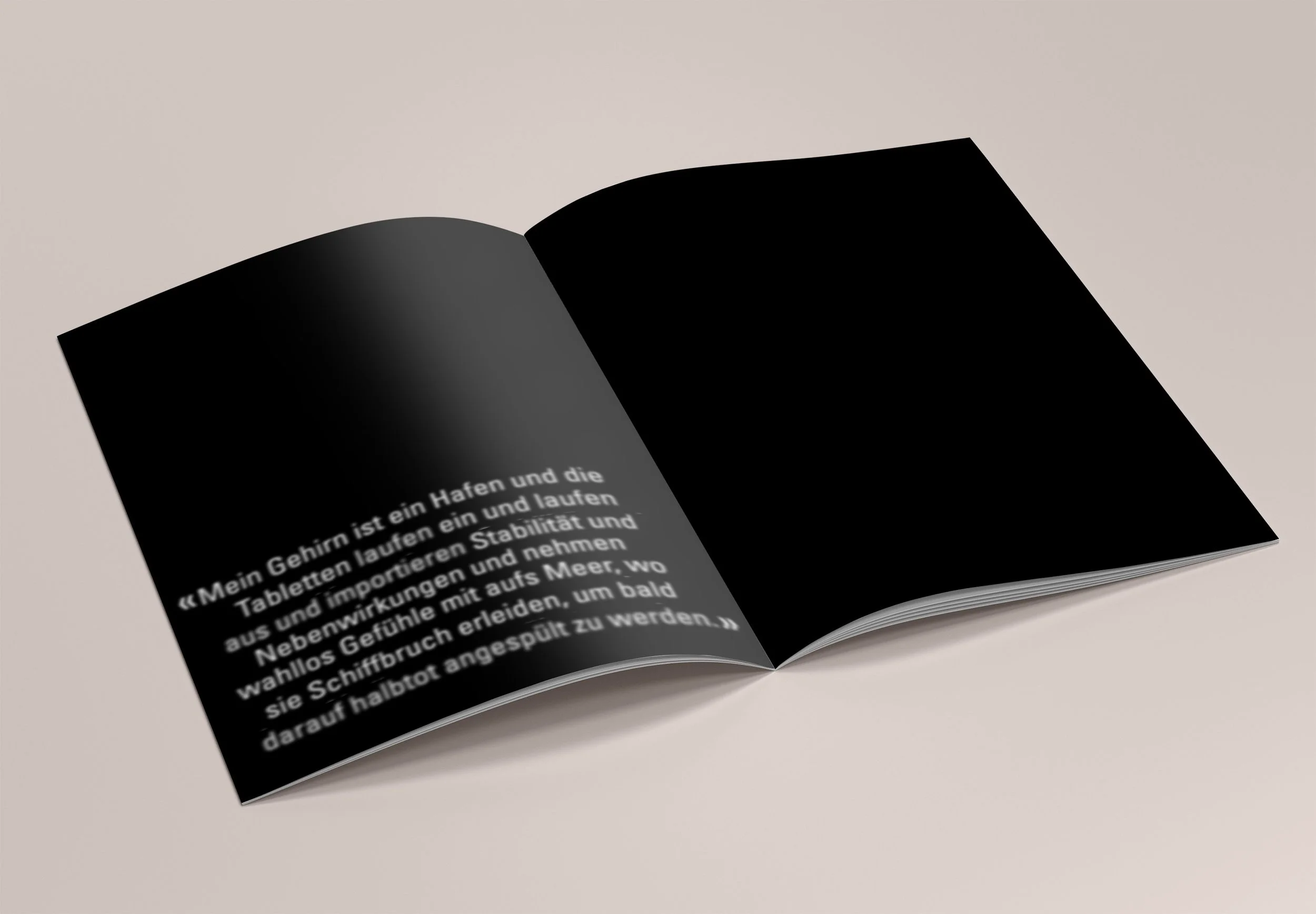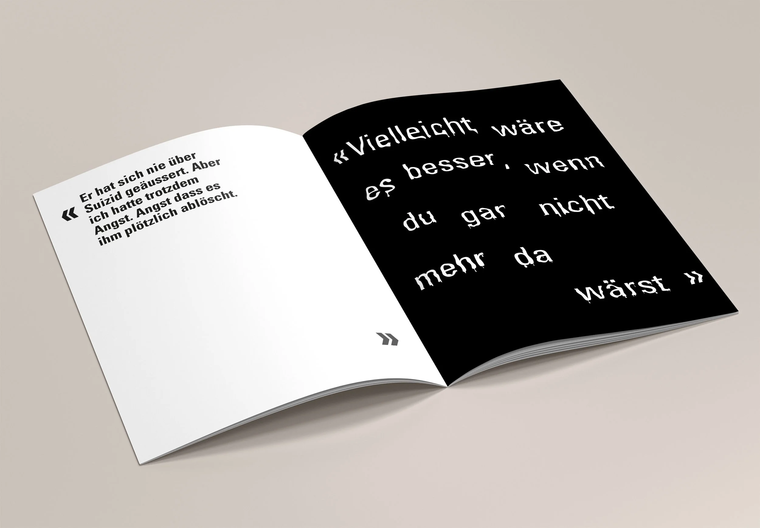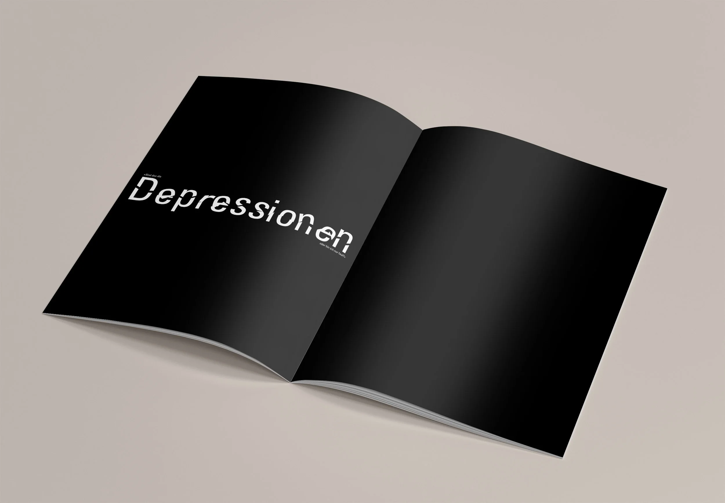 Angesprochen wird in dieser Broschüre das Thema «Depression». Gefühle und Gedanken von Menschen mit Depression werden in der Broschüre typografisch erlebbar gestaltet.